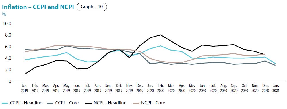 Despite some acceleration in food inflation, headline inflation remained muted in 2020. Under the current flexible inflation targeting framework, the Colombo Consumer Price Index (CCPI) based headline inflation remained broadly within 4-6% across the year, and low levels of demand-drive inflationary pressures meant that core inflation remained subdued. This enabled the CBSL to ease monetary policy to historic levels to buoy the ailing economy. The Standing Deposit Facility Rate (SDFR) and the Standing Lending Facility Rate (SLFR) were both reduced 5 times during the year by a total of 250 bps (4.5% and 5.5%, respectively, at year’s end) and the Statutory Reserve Ratio (SRR) was reduced twice by a total of 300 bps (2% at year’s end). In addition, the CBSL introduced loan moratoriums, special lending schemes at concessionary rates, and interest rate caps on selected lending products to quicken the transmission of the monetary policy.