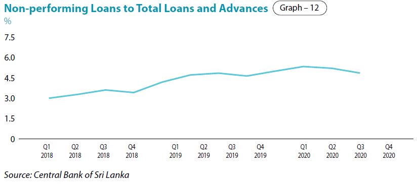 Rupee deposits were the major source of funding for the banking sector and showed a marked increased over the year. This increase was driven by the drop in discretionary spending due to the pandemic and by the movement of deposits from the Non Bank Financial Institution (NFBI) Sector to the banking sector. The growth in rupee deposits increased from 7.9% in 2019 to 19.3% in September 2020 YoY (foreign currency deposits showed a growth from 14.0% to 14.3% across the same period). This surge of deposits meant that the loan-to-deposit ratio fell from 88.2% in December 2019 to 84.8% in September 2020. The overall profitability of the banking sector declined due to the falling Net Interest Margin resulting from policy measures taken by the Monetary Board, though this was balanced somewhat by an increase in non-interest income and a decrease in non-interest expenses and taxes during the nine month period ending September 2020 (compared to the corresponding period of the previous year). In spite of the difficult macroeconomic climate, the sector maintained healthy capital adequacy ratios (CAR), recording a Tier 1 CAR of 13.0% and a total CAR of 16.5% as of the end of September 2020. Return on Assets (ROA) of the sector increased marginally from 0.93% to 0.97% YoY in September 2020, while Return on Equity (ROE) increased from 10.5% to 10.9% YoY during the same period. Continued drops in lending rates, implementation of special loan schemes, and improving investor sentiment is expected to drive credit growth in all sectors of the economy in 2021.