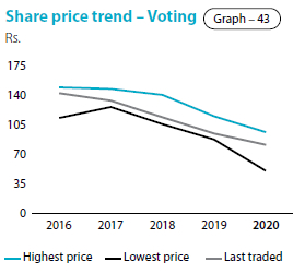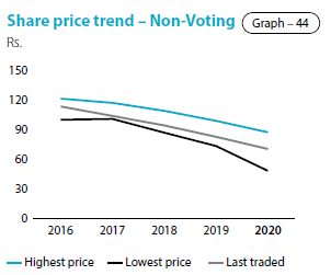 The market price of an ordinary voting share of the Bank decreased by 19.10% (a drop of 17.39% in 2019) from Rs. 95 at the end of 2019 to Rs. 80.90 at the end of 2020 (Table 48). The Bank maintained its policy of issuing scrip dividends and continued with its Employee Share Option Plans. Market capitalisation for both voting and non-voting shares in turn decreased from Rs. 97 Bn. (USD 532.699 Mn.) in 2019 to Rs. 94 Bn. (USD 500.902 Mn.) in 2020, accounting for 3.16 % (3.40% in 2019) of the total market capitalisation. The Bank's shares ranked fifth among all listed entities and first among the listed corporates in the Bank, Finance and Insurance sector. During most of 2020, the movement of the non-voting share price followed the trend of the voting shares.
