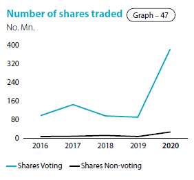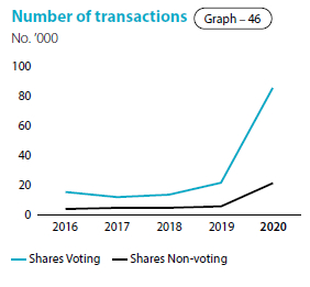 Despite the continuous lacklustre performance of the bourse, there was continued investor interest in the shares of the Bank during the year, as depicted in the increased number of transactions (Ordinary shares - Voting 300% and Ordinary shares - Non-Voting 293%) compared to 2019 (Refer Table 51). Despite the early drop due to the outbreak of the Pandemic, the CSE concluded 2020 on a mixed note, the ASPI gaining by 10.52% from 6,129 in 2019 to 6,774 by the end of 2020, while the S&P SL20 closing 2020 on a negative note, decreasing by 10.18% from 2,937 in 2019 to 2,638 by the end of 2020.